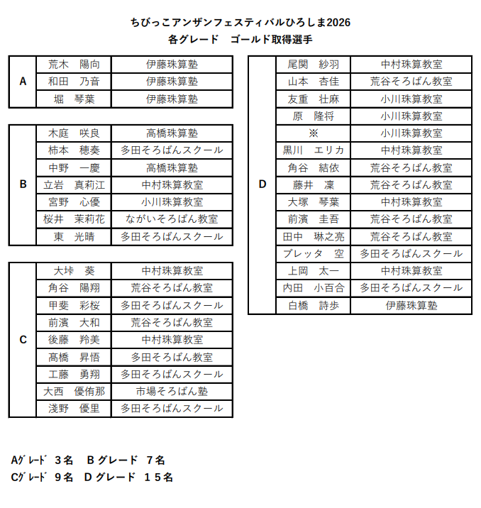 2026年2月14日(土)~2月28日(土)ちびっこあんざんフェスティバルひろしま2026(通信形式)が各教室・塾・学校等で行われました。A~Dのグレードごとのスタンダード暗算と、各開催場所ごとに工夫を凝らされたお楽しみ抽選会が実施されました。