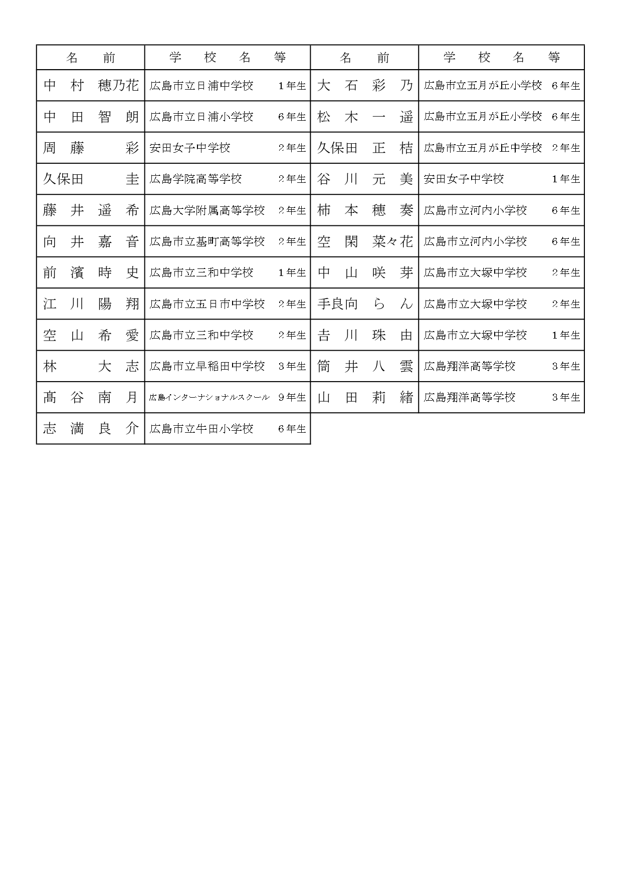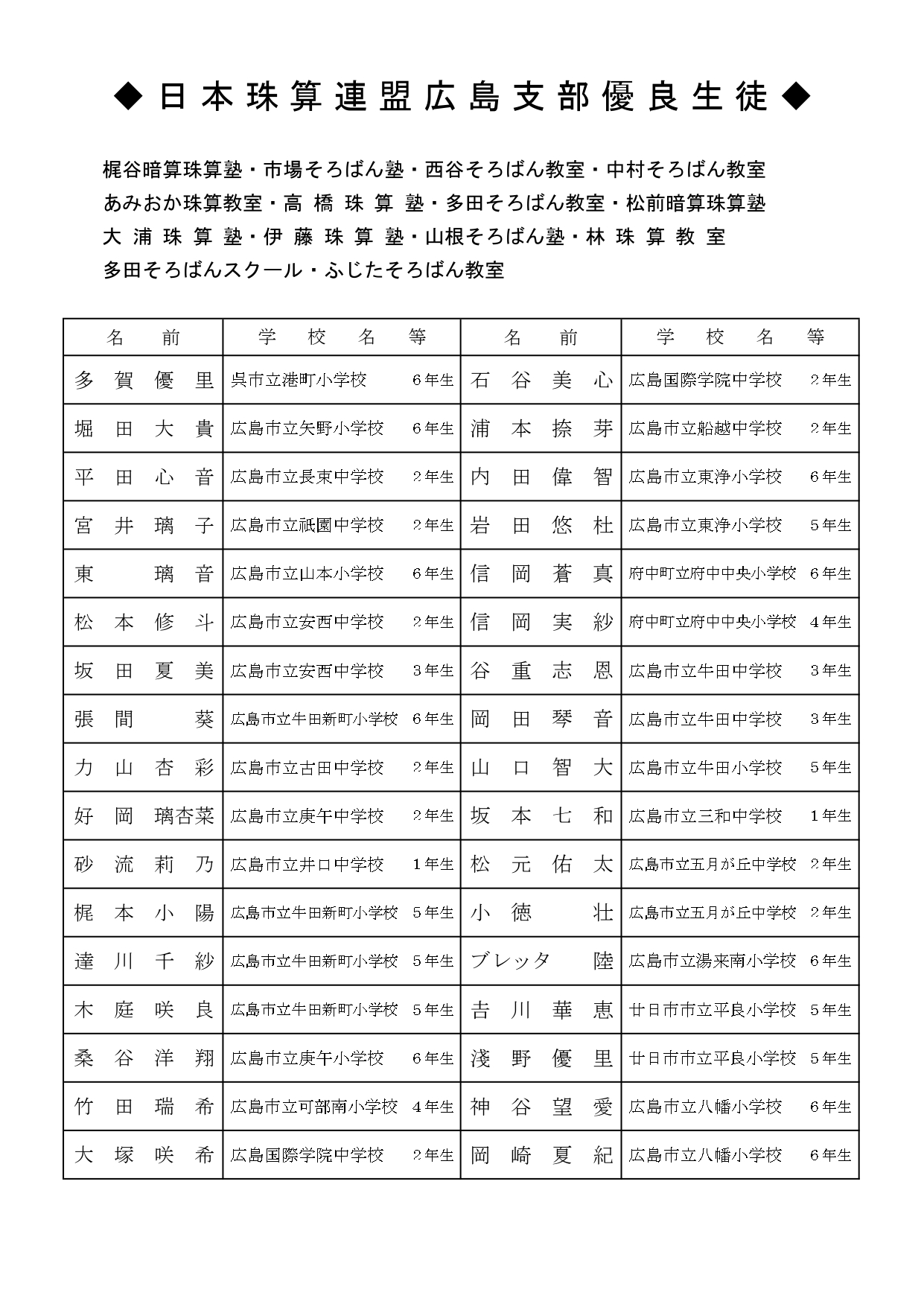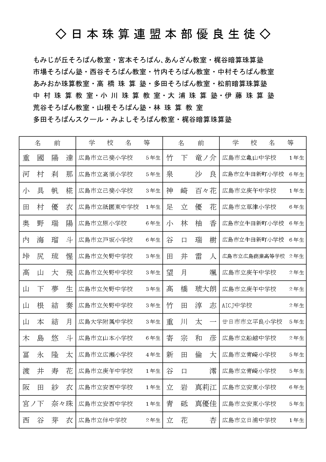 ◆日本珠算連盟本部優良生徒 / ◆日本珠算連盟広島支部優良生徒